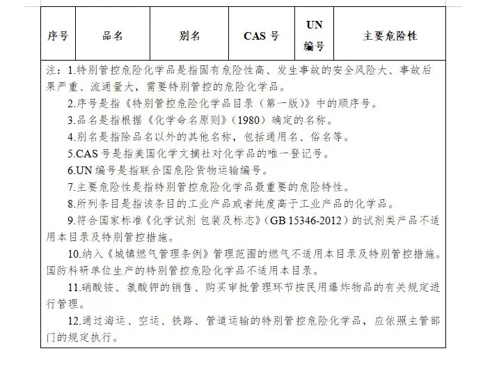 對列入《特別管控危險化學品目錄(第一版)》的危險化學品應針對其產生安全風險的主要環節,在法律法規和經濟技術可行的條件下,研究推進實施以下管控措施,最大限度降低安全風險,有效防范遏制重特大事故。